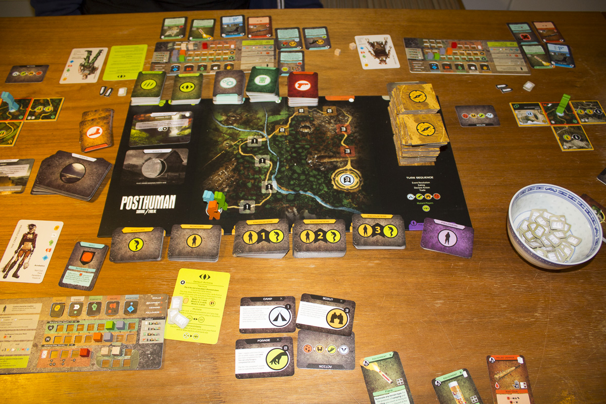 So gleich machten wir uns ans Spielen. Jeder suchte sich einen Charakter aus, bekam seine Startgegenstände bzw. Fähigkeiten, und übertrug seine Fertigkeiten wie Intelligenz, Schnelligkeit, Stärke, Nahkampf und Waffen auf seinen Charakterbogen. Ebenfalls die Werte für Moral, Gesundheit und das Equipment wurden eingestellt. Nun konnte es losgehen. Jeder startet auf einem identischen Startplättchen und wählt verdeckt seine Aktion, die Bewegung, Erkunden, Campen und Durchsuchen sein kann. Bewegt man seine Figur auf ein neues Plättchen, nachdem man es zuvor erkundet hatte, kommt es zu Begegnungen. Diese können sehr gefährlich sein, gerade am Anfang, wenn man noch nicht so stark ist und noch keine zusätzlichen Waffen und Ausrüstung gefunden hat. Aber nur so kommt man auf seiner Reiseroute voran, um als erstes die rettende Festung zu erreichen.