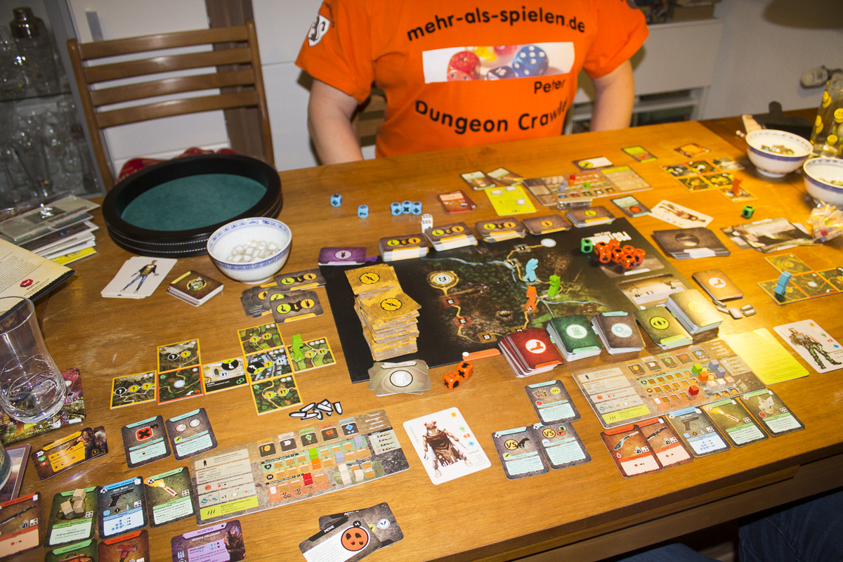 Auf der Messe ging es nicht anders Peter, auch das Spielbrett war nicht größer, nur der Tisch auf dem wir gespielt hatten :D . Es ist halt ein semi - kooperatives Spiel, das heißt man kann miteinander spielen und sich gegenseitig unterstützen, muss es aber nicht, das ist halt immer von der Situation abhängig :o Ich fand es trotzdem sehr nett, das Du mir gestern den Abend gerettet hast und mir Munition und Nahrung geschenkt hast ;), bei nächster Gelegenheit werde ich mich natürlich entsprechend revanchieren :D . Und war halt ab dem Moment ein anderes Spiel, als Martin nicht genügend Nahrung zur Verfügung hatte, dadurch demoralisiert wurde und zum Mutanten geworden ist, wäre das nicht passiert, hätte das Spiel ganz anders ausgehen können, da ihr beide doch ziemlich dicht beieinander ward :?, so hat er sich selber aus dem Spiel genommen :( :oops: und von nun an natürlich als Mutant versucht gegen uns zu arbeiten, was aber natürlich nichts gebracht hat. :lol: Ich freue mich schon auf die nächste Partie, in der ich mich dann am Anfang nicht gleich aller Chancen beraube. :cry: